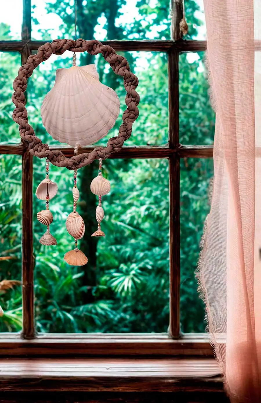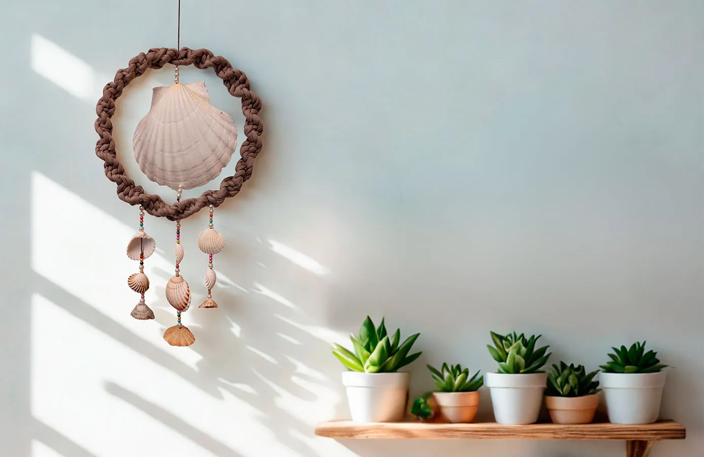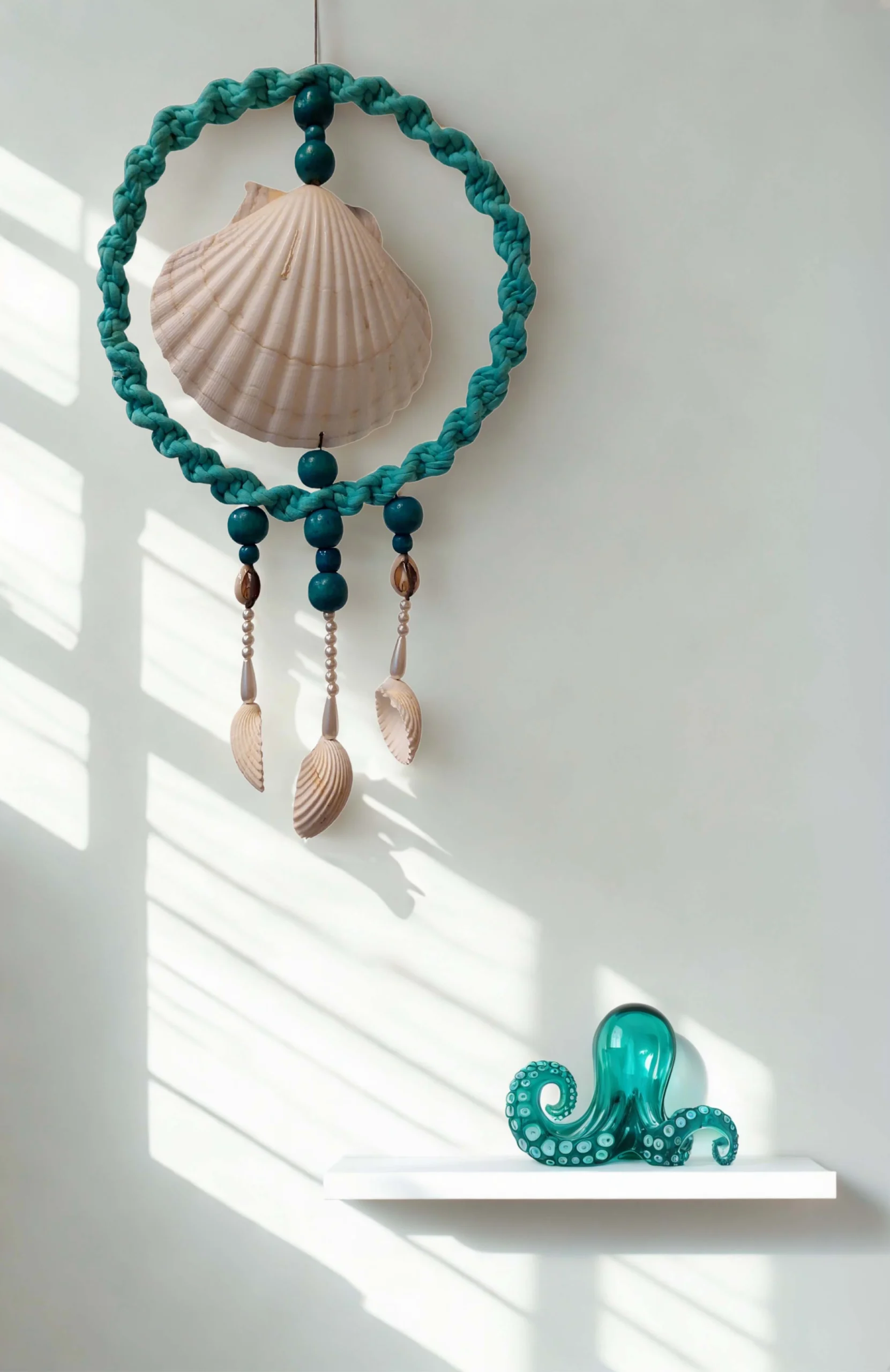 Decoración marinera artesanal con macramé y conchas.