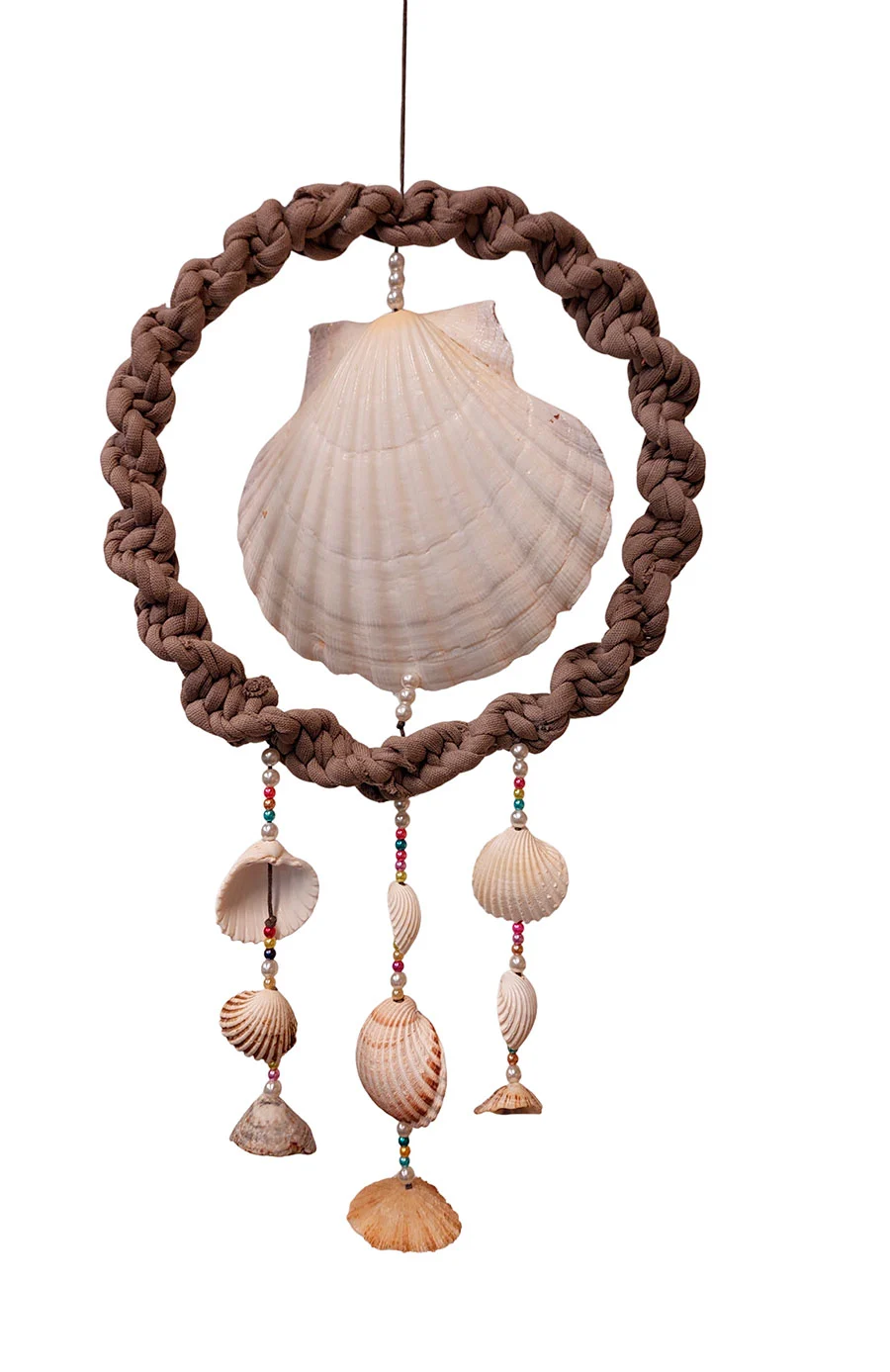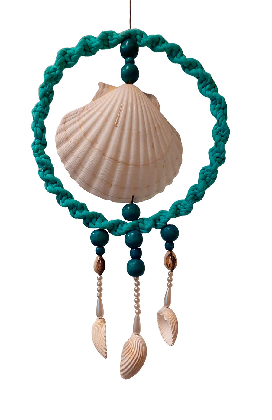 Su diseño combina una vieira central, rodeada por un círculo de macramé, del que cuelgan pequeñas conchas marinas y cuentas.